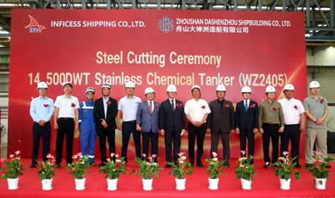 6月19日,舟山大神洲造船有限公司為Inficess Shipping CO., LTD.建造的14500DWT 不銹鋼化學品船(WZ2405)在盤峙廠區舉行開工儀式。