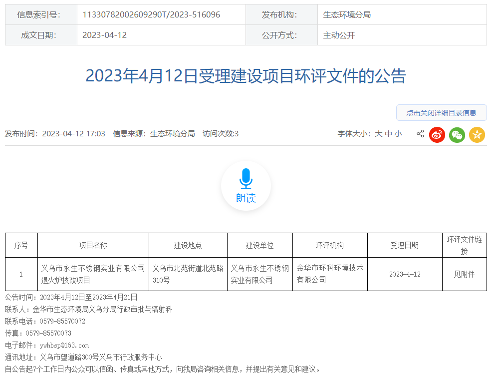 4月12日,金華市生態(tài)環(huán)境局義烏分局受理義烏市永生不銹鋼實(shí)業(yè)有限公司退火爐技改項(xiàng)目環(huán)境影響評(píng)價(jià)報(bào)告表并對(duì)外進(jìn)行公告,公告期:7個(gè)工作日。